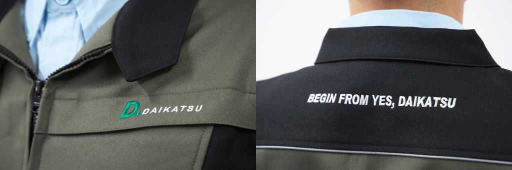 現納業者という利点はあったものの、当社のことを良く勉強していただいたことが大きかったです。他社様も今風のスタイリッシュなデザイン提案をしていただき、そのまま採用しても問題ないだろうと思う内容でしたが、ダイイチさんの熱意と提案力が優れていましたので、業者決定させていただきました。企業理念の「BEGIN FROM YES、DAIKATSU」というメッセージを背中に刺繍するというアイディアも採用させていただきました。